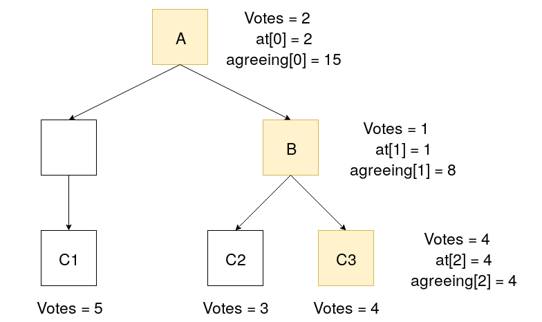Consider the binary block tree as illustrated. Let us verify the validity of block C3. First, we compute some additional data: agreeing[] and at[] arrays. agreeing[h] stores the number of votes consistent with block C3 upto height h in C3’s branch. at[h] stores the number of votes that support exactly the block at height h in C3’s branch. Note that agreeing[]is sorted in decreasing order.
