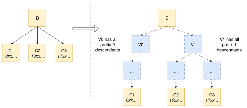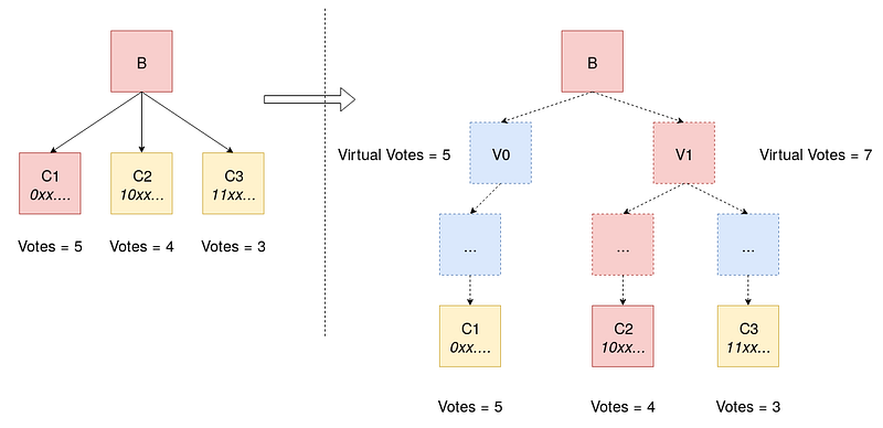 - For every block V in the bitwise-tree, create “virtual” children blocks V0 and V1. Mark all descendants of V that have hash with prefix 0 as descendants of V0, and all descendants of V that have hash with prefix 1 as descendants of V1. If the hash of a certain block from the original block tree is reached, then replace that virtual block with the actual block. and repeat from step 1 assuming this block as the root.