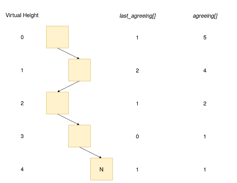 We will maintain a mapping of virtual height to number of validators having that height as last agreement height (let’s call this the last_agreeing[] map). After receiving a new block, we will just makes updates to last_agreeing[] from it’s previous block. The range of last_agreeing[] is going to be the depth of the block, say h.