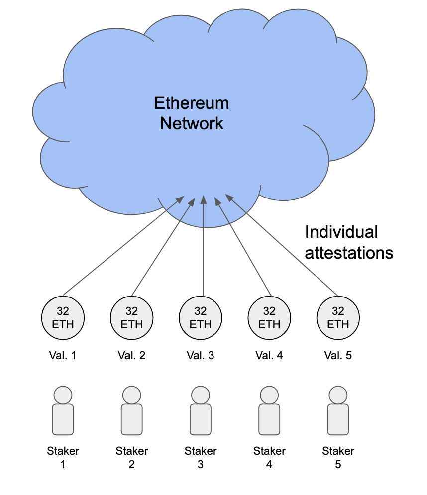 Each validator in the above figure is controlled by a distinct staker. The validators send their individual attestations into the Ethereum network for aggregation. Overall, the network processes 5 messages to account for the participation of 5 stakers in the protocol.