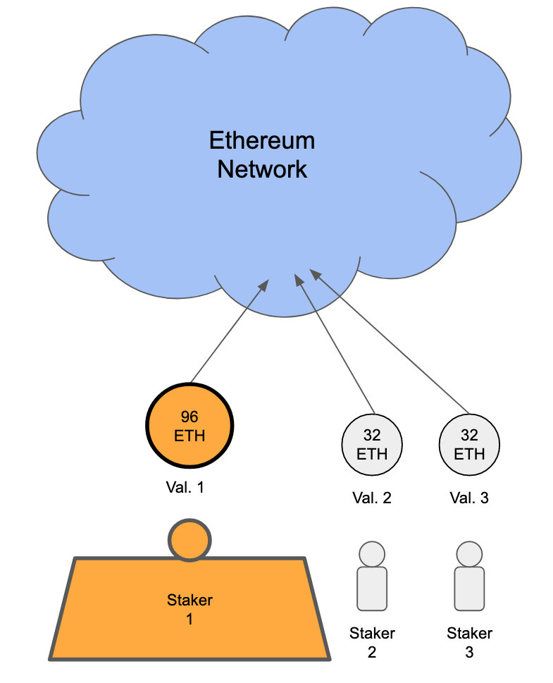 The network is now processing 3 messages on behalf of the large staker. As compared to a staker with a single validator, the network bears a 3x cost to account for the large staker's participation in the protocol.